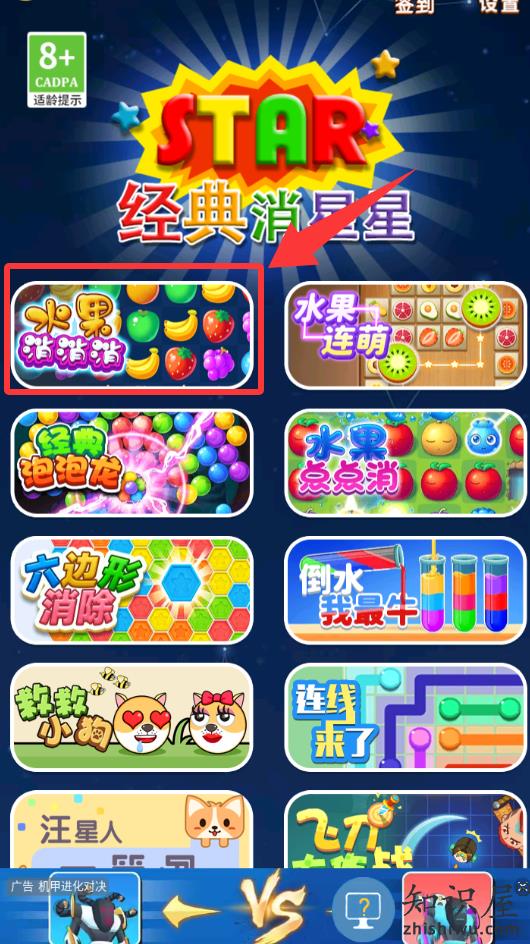 2、进入游戏界面点击红色框框咯的水果消消消并进入。