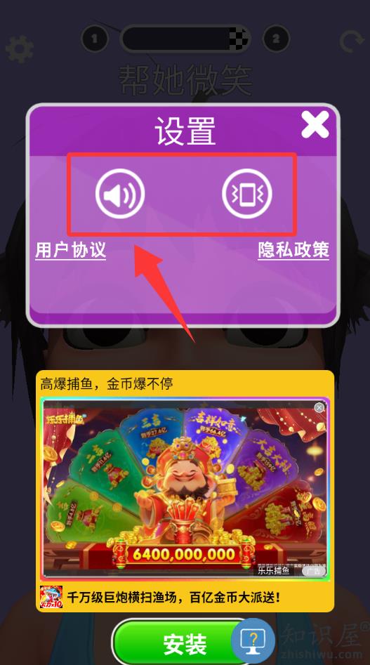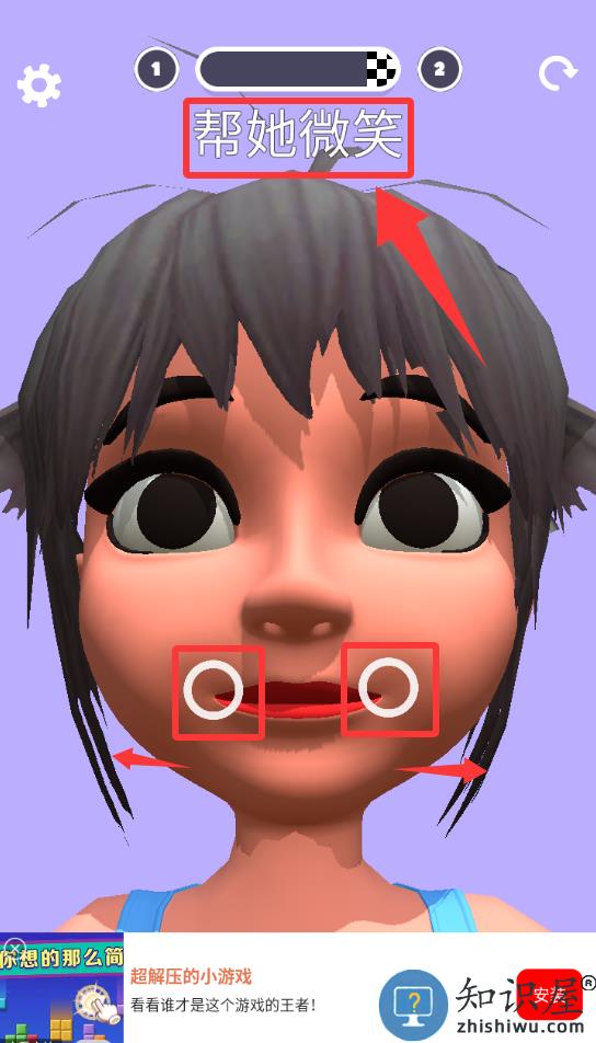 3、进入游戏这关任务是帮她微笑,点击她的嘴两边撑开就可以通关了。
