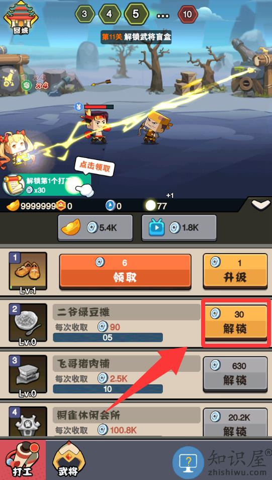 4、然后再点二爷绿豆摊并解锁,每秒都会有收益的。