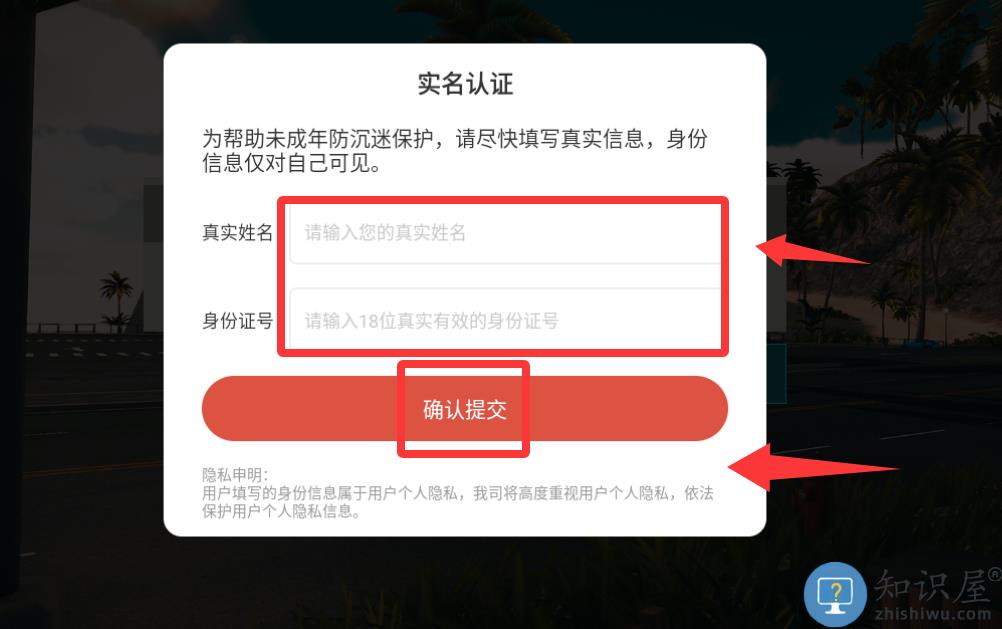 2、输入你的真实姓名和身份证号码并点击确认提交。