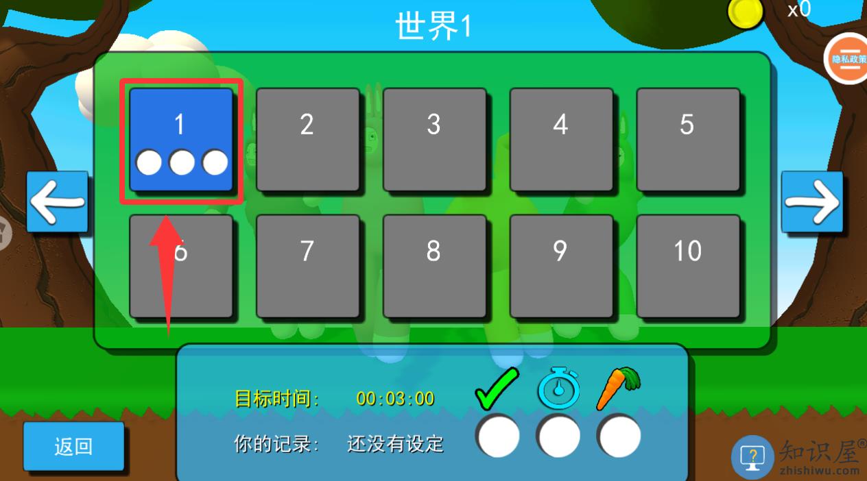 3、进入游戏关卡选择点击红色框框里的第一关。