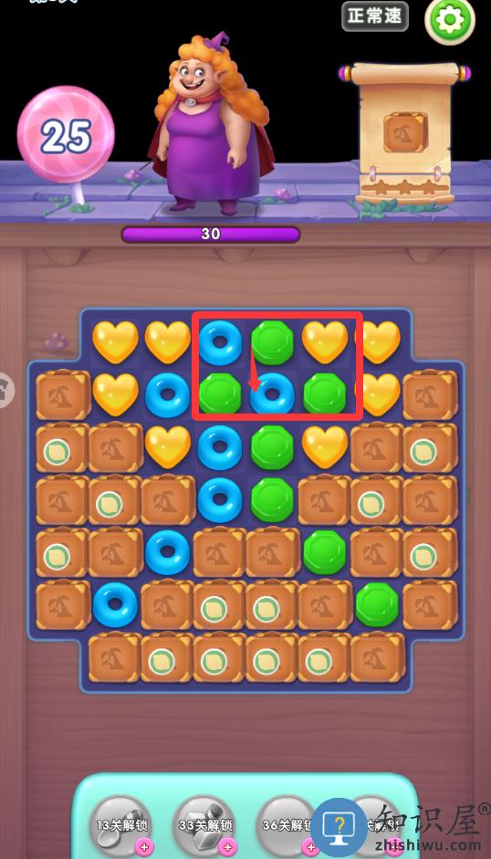 1、在4个彩虹糖罐的中心,有4根巧克力棒围成了一个正方形,并在其上下左右3个单元格的位置上分别有1个甜蜜导弹。纵观全局不难发现,唯有利用好这个区域上的糖果,才能将巧克力棒击碎,还能利用甜蜜导弹的加成快速收集糖果,因此将此区域做为本关的重要区域。