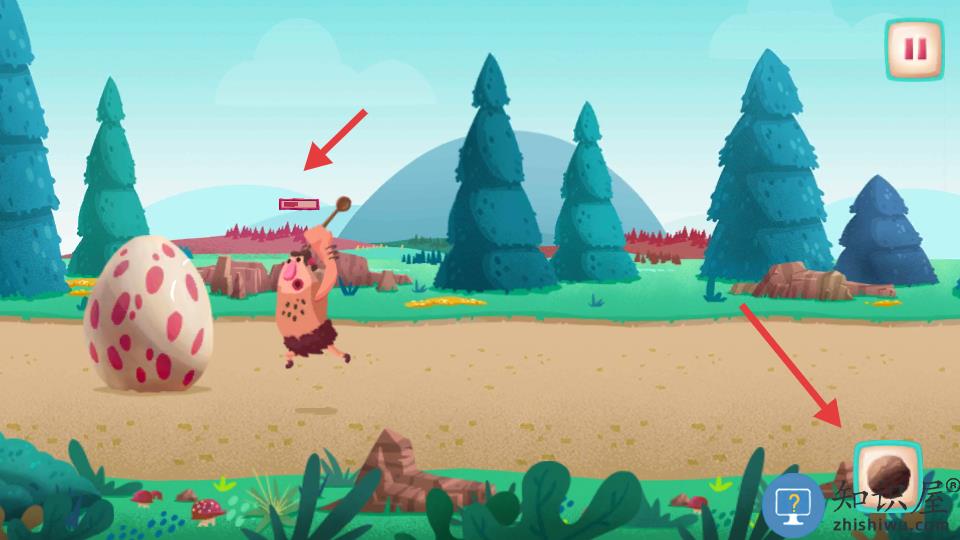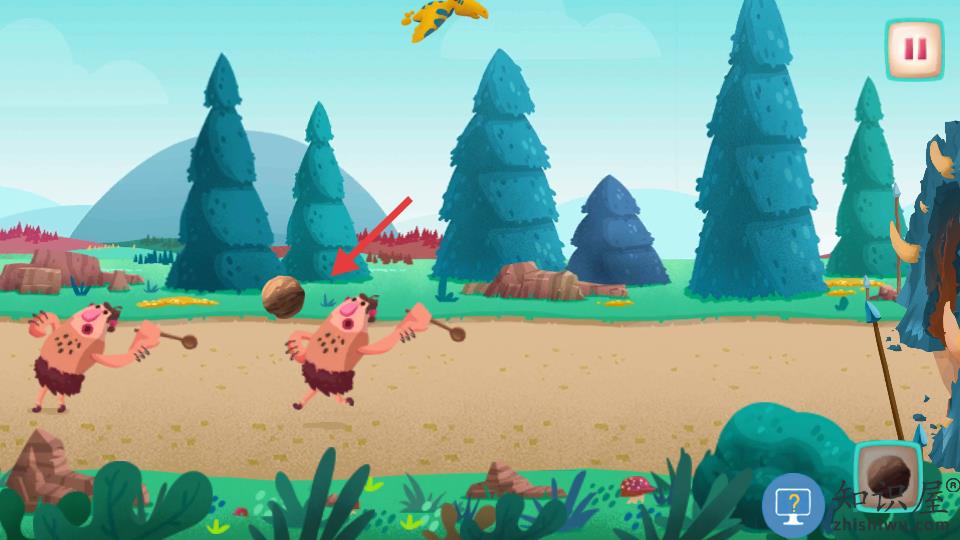 1、点击右下角的石块不动,把它拖到原始人的头顶形成一个标靶。