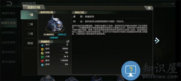其他建筑生命值普遍偏少的反抗军都指挥中心却在1到3本比其他两个阵营要多,分别为:1本19100血,94甲