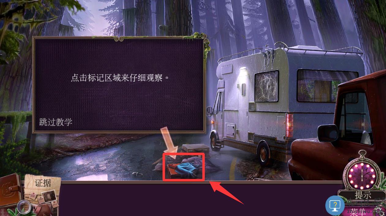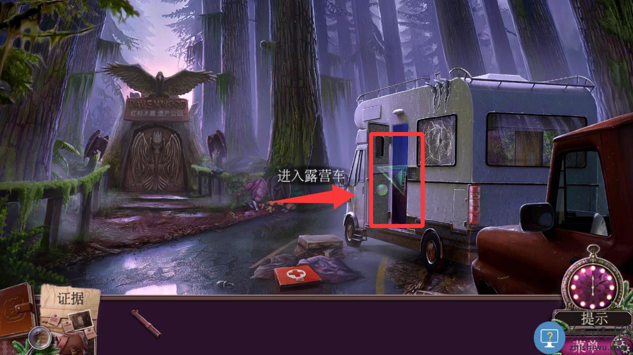 2、点击红色框框里的露营车并进入收集证据。