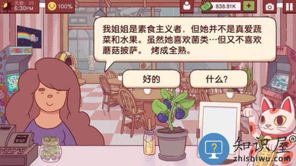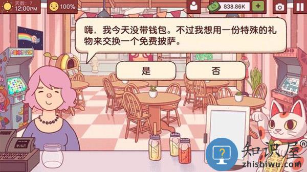 3、有一个粉色头发头上有颗草的姐姐要用特殊礼物换免费披萨。点“是"给她做什么都可以。我做的是酱料+芝士+意大利辣肠。送了一个花盆,可以种出来茄子。