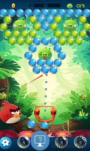 1、瞄准绿色小猪,发射蓝色泡泡消除目标。