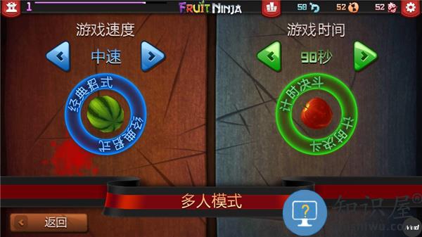 Zen:图标为苹果的Zen模式中,没有炸弹,只会不断出现水果,时间为1分半。在这一分半内谁因连击而切出的分数越高,谁就是胜利者。游戏不会因水果的掉落而失败。
