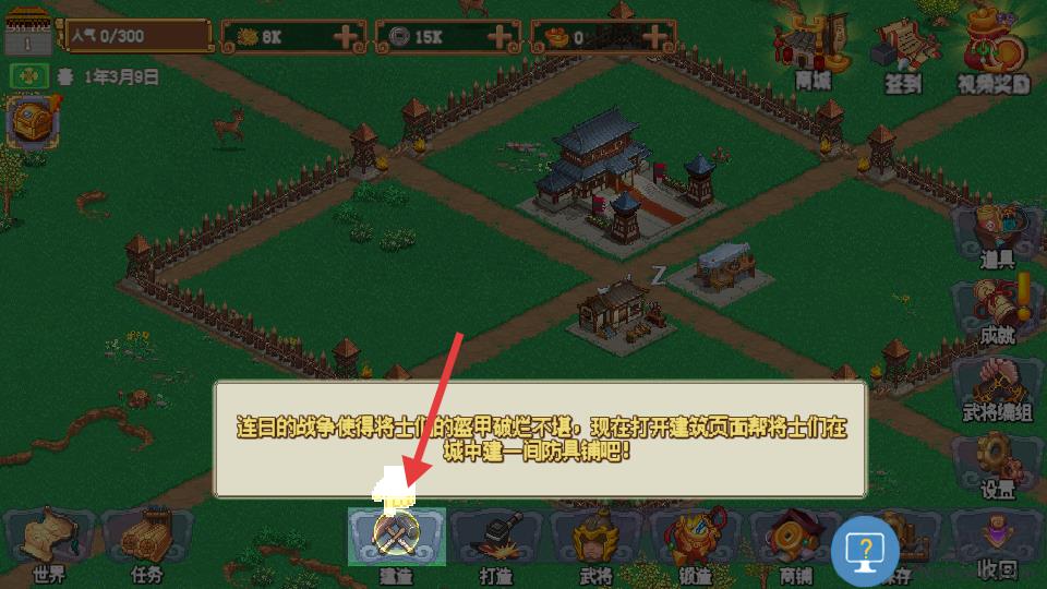 游戏的主场景是玩家管辖下的城镇场景,在这里玩家还可以招募士兵、颁布政令、打造装备,将城镇经营的欣欣向荣,做好后勤就能为前线征战的英雄增添实力。