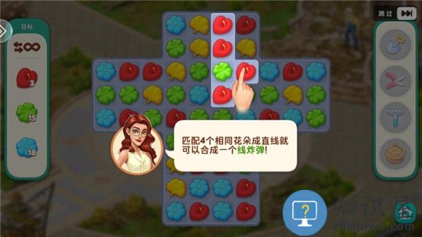 5、匹配4朵相同的花成直线可以合成一个线炸弹。