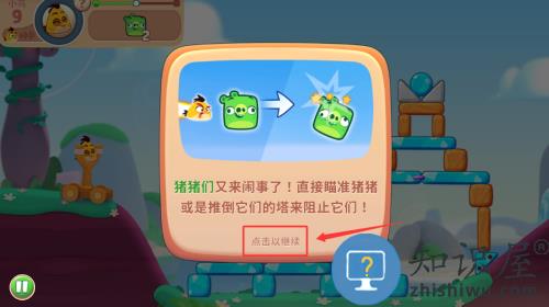 1、点击屏幕继续,了解用弹弓打猪或拆塔玩法。