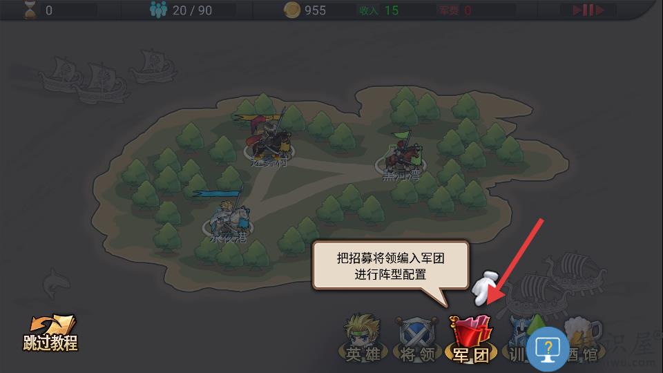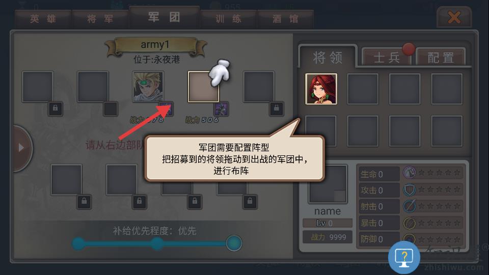 1、玩家需搭配兵种阵容并装备技能组建军团。