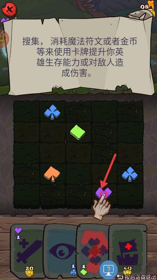 2、通过翻格子探索房间收集卡牌与道具强化角色能力。
