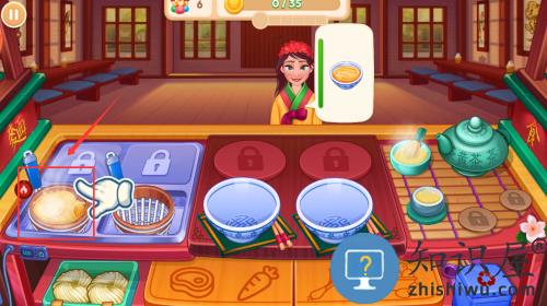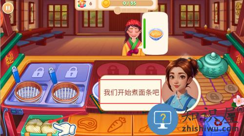 1、根据对话框提示点击面条图标,开始学习煮面条基础操作。