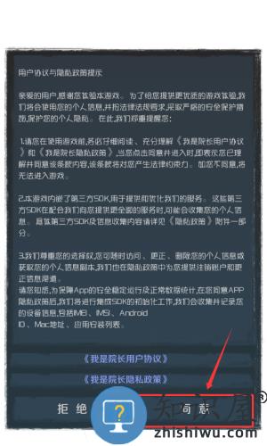 1、阅读协议后点击红色箭头指向的同意按钮进入游戏。