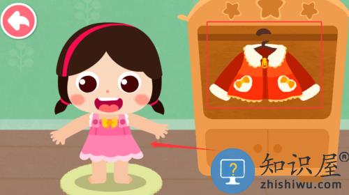 2、按照箭头指引从衣柜选取橙色外套,为小女孩进行换装搭配。