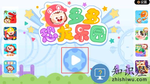 2、在主界面找到被红框和箭头指向的蓝色齿轮播放按钮,点击开始多多恐龙乐园游戏。
