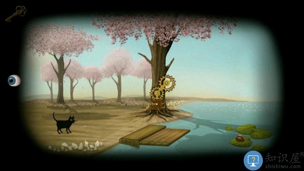 春天,来到雕像那里,推开地上的木头堆出现一个小洞,猫咪进去