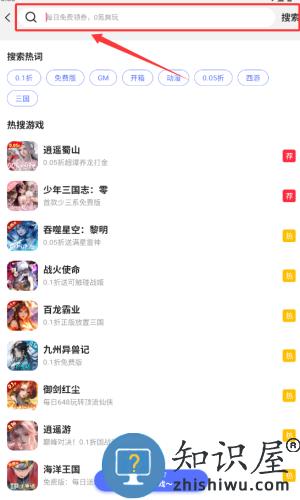 3、在搜索框输入游戏名,或点击红框热词快速查找。