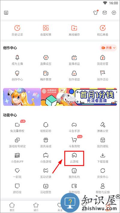 ·进入右下角【我的】版块,在【功能中心】找到【云游戏】,点击;