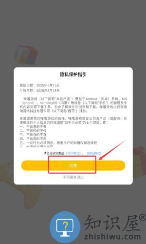 1、阅读隐私保护指引后,点击红框箭头指向的黄色同意按钮。
