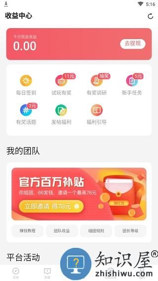 3、点击收益中心,可以将钱都,答题,试玩,参与问卷调查等方式得到的金币提现