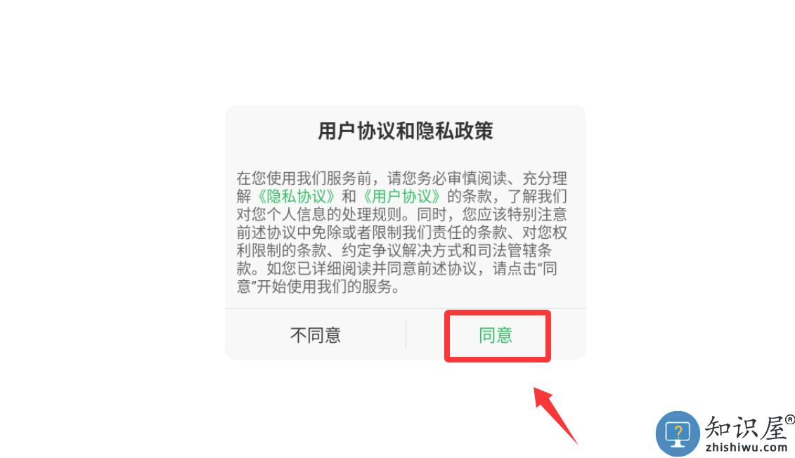 1、点击用户协议和隐私政策里的同意并继续。