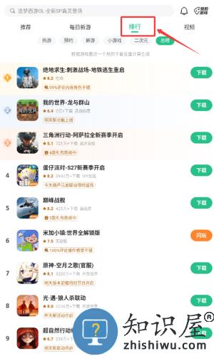 2、在排行榜界面点击红框标注的下载按钮,安装游戏。