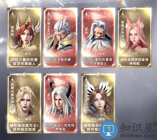 该阵容中的精英伙伴和阿努比斯是游戏前期送的,中途抽到定位相同的伙伴可以直接替换。晨曦光辉作为少有的远程单点输出,属于主C的最佳人选之一,一些前排较肉的关卡可以比较轻松突破。副C的位置可以用其他类似的输出替换,例如慈悲的老艾德、风语者凯兰崔尔等。