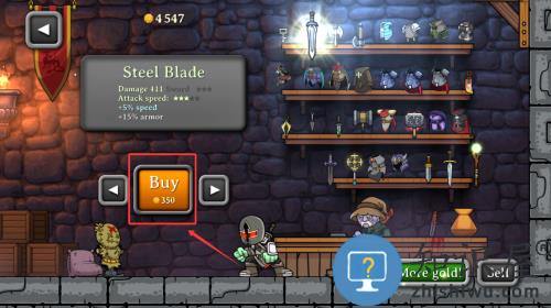 3、点击红框箭头指向的购买按钮,花费350金币买钢剑。