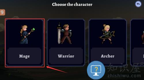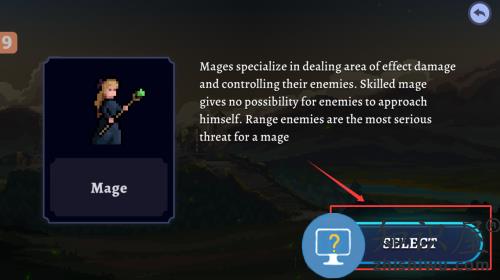 1、点击红框箭头指向的法师角色卡,选择职业开始游戏。