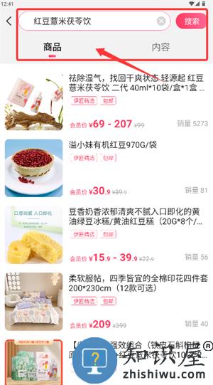 2、在顶部搜索框输入名称,通过切换标签可区分商品与内容结果。