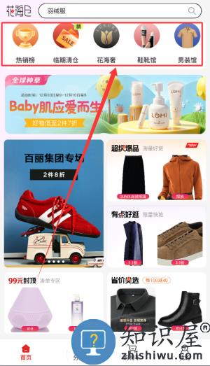 3、首页展示热销榜单、临期清仓、鲜花奢品、鞋靴专区及男装馆等信息。