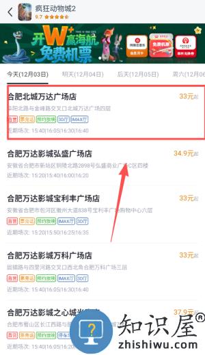 2、在影城选择页面定位所在城市影院,确认后点击购票选项。