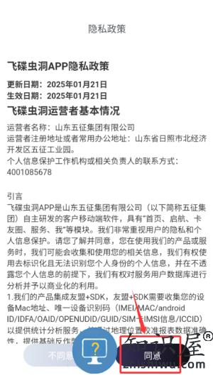 1、在飞碟虫洞APP中点击"同意"隐私政策,进入登录注册界面。