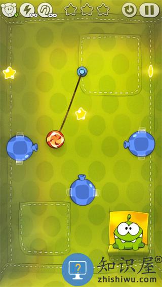 3、点击右边的蓝色气球,将糖果吹起去接左上方的星星。