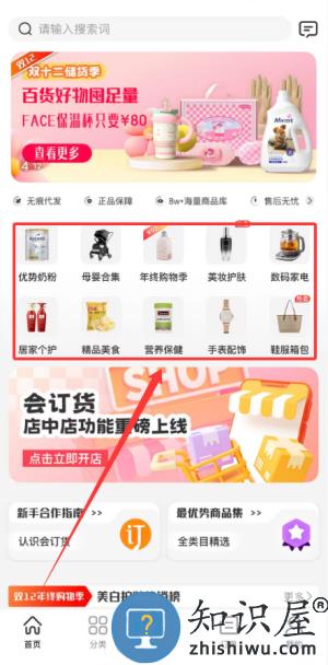 3、首页提供优质奶粉、母婴套装、美妆护肤、数码家电、家居个护及美食精选。