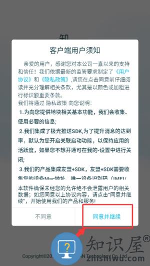 1、在客户端用户须知弹窗中点击"同意并继续",进入手机号登录页面。