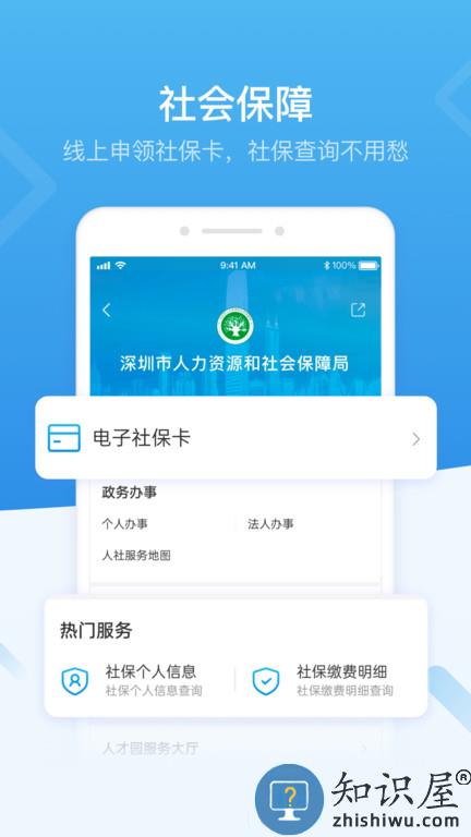 · 社保/公积金:为深圳市民提供个人社保信息查询、个人参保管理、技术资格查询、租房和生活补贴申请等人事人才和社会保障服务;