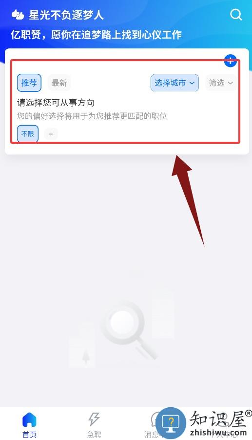 2、首页支持按推荐、最新及城市维度筛选,并可选择从事行业方向。
