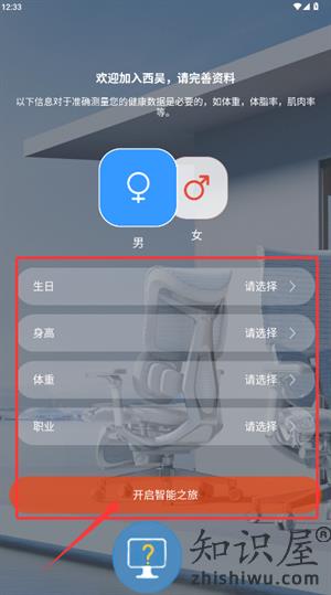 1、启动应用后,请在资料填写页选择性别,输入出生日期、身高体重与职业等信息。