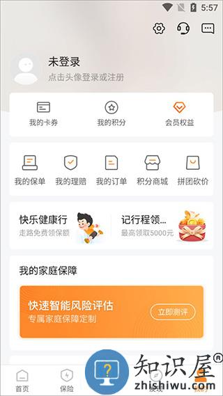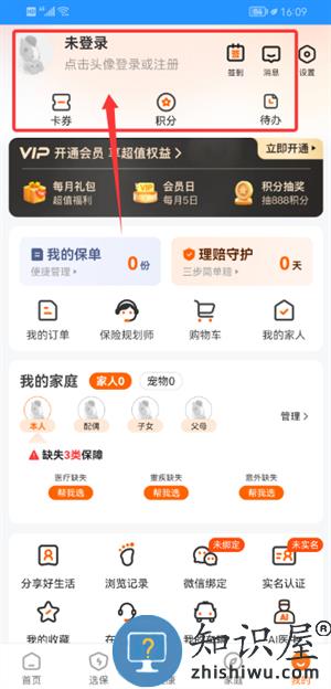 2、进入应用我的界面,点击头像登录或注册,并可查询订单与保单信息。