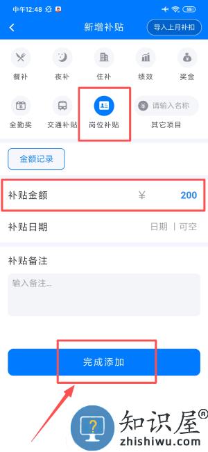 3、选定补贴类型填写金额后,点击完成添加即可。
