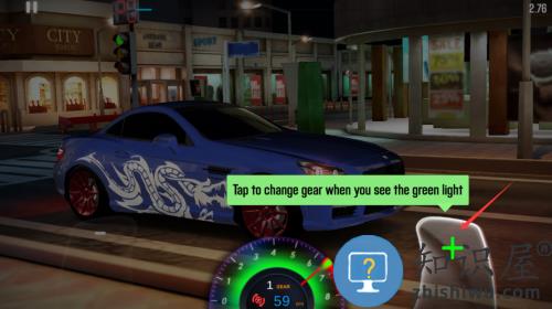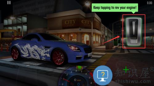 1、在绿灯亮起时,点击红框箭头指向的油门按钮。