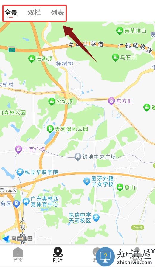 3、附近界面支持全景、双栏和列表三种模式,方便查看周边。