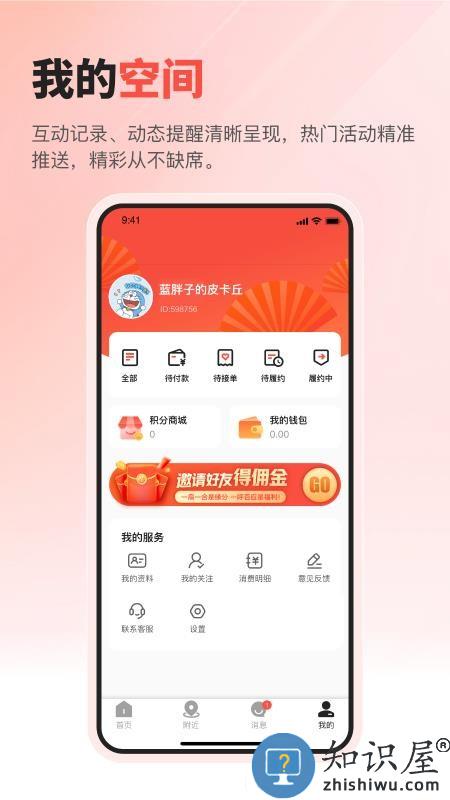 4、个人中心集成集中管理关注商家、预约记录、积分明细、优惠券等个人资产,并提供邀请好友获取奖励的社交推广功能。