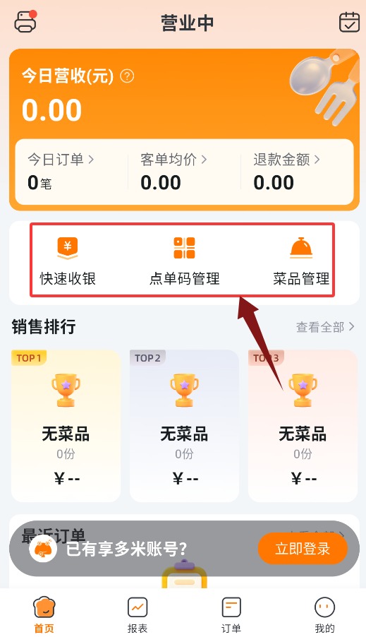 2、首页支持快速收银、点单码管理与菜品设置等常用功能。