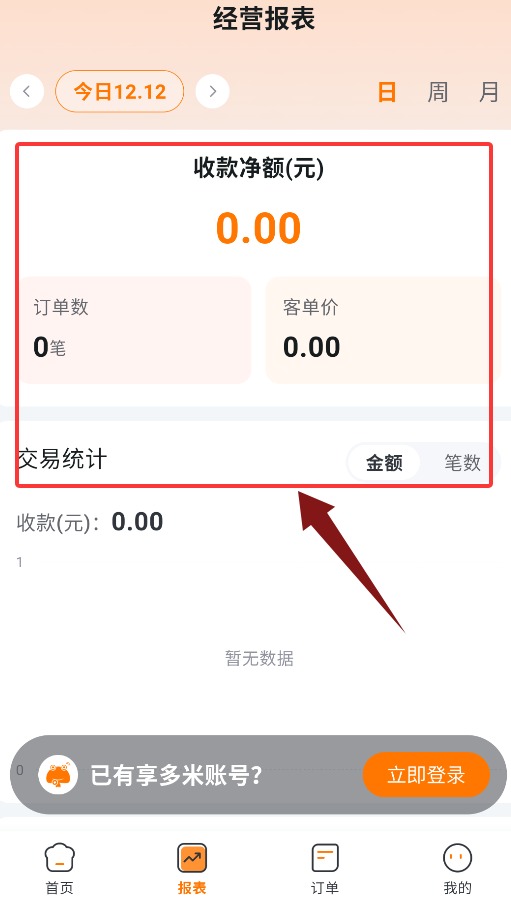 3、报表界面可查看收款净额、订单总数与客单价等经营数据。