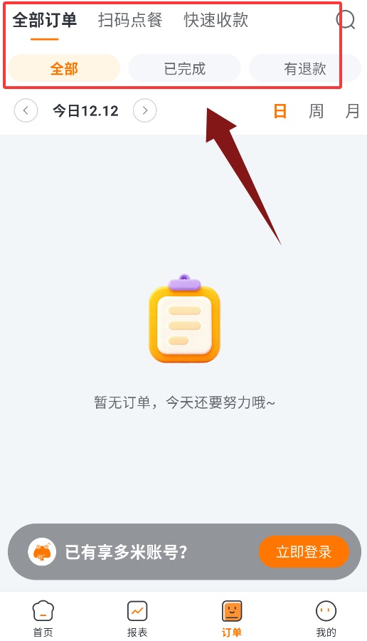 4、订单界面提供全部订单、扫码点餐与快速收款等分类查询。