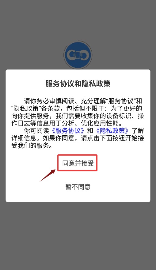 1、首次启动应用需点击同意并接受,确认后方可进入主界面。